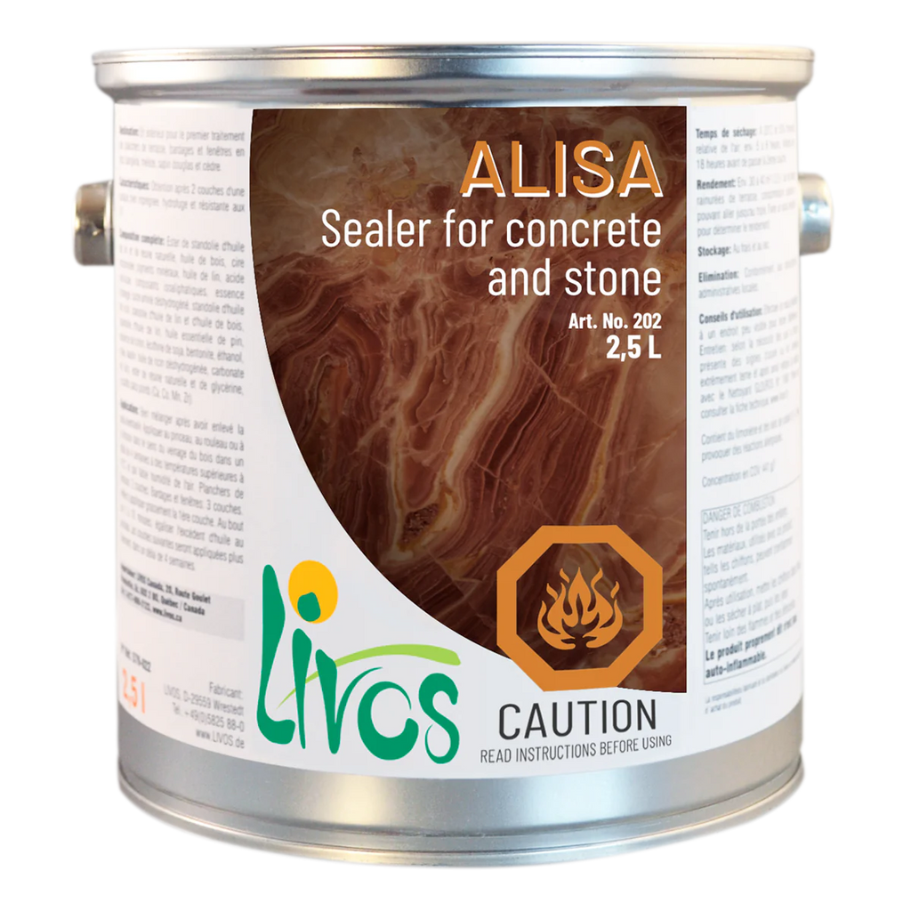 Finishing oil for indoor or outdoor use on natural stone surfaces such as slate, quartz, granite, marble, and Solnhofen limestone. ALISA by Livos is a deep-penetrating, waterproofing oil that is resistant to moisture and stains. Easy-to-maintain satin finish. Waterproof and stain-resistant formulation.