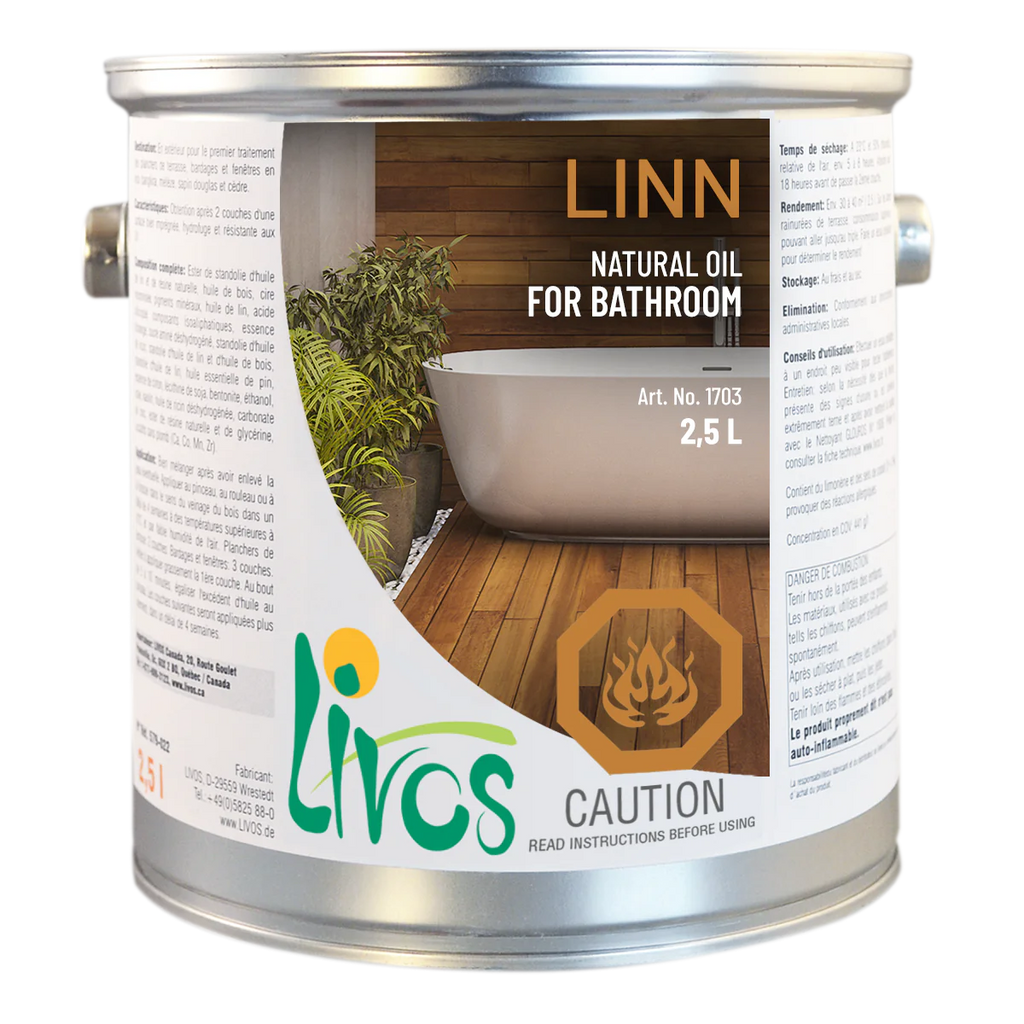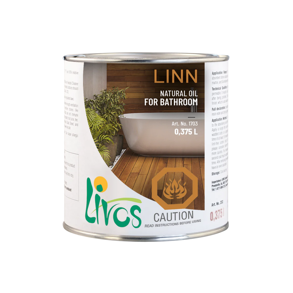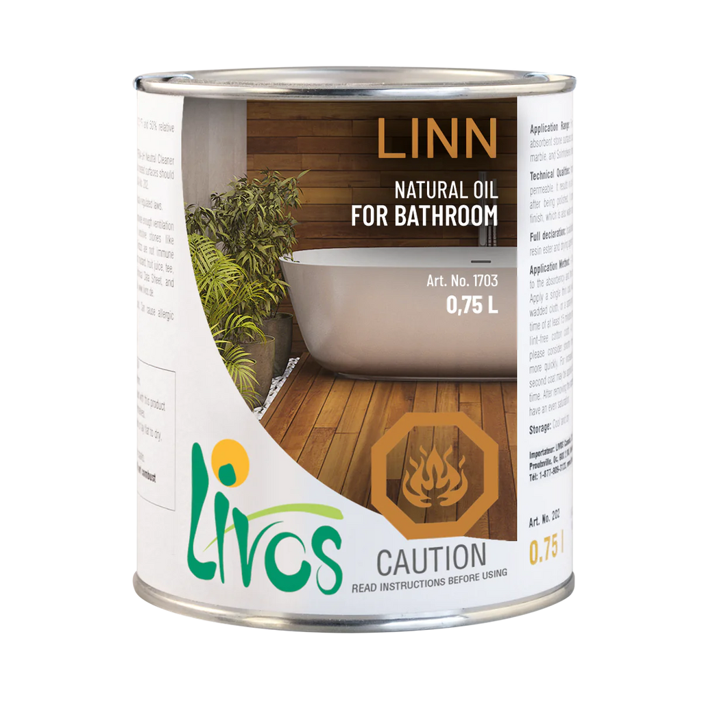 LINN natural finishing oil by LIVOS is designed for use on wood that is exposed to high humidity conditions such as those typical in bathrooms. Composed of linseed oil and natural resin, transparent LINN wood oil deeply penetrates wood, providing superior protection against moisture and heat compared to traditional varnish.